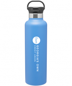 24 oz powder coated double wall 18/8 stainless steel thermal bottle with copper vacuum insulation, threaded gear-shaped insulated lid and carrying handle Complies with FDA, Prop 65. 11.25" H x 3" W