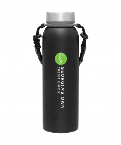 32 oz double wall 18/8 stainless steel thermal bottle with copper vacuum insulation, insulated stainless steel threaded lid, silicone ring, removable strap with buckles, removable clasps, and powder coated finish. Individual gift box. Hand wash recommended. Do not microwave. Complies with FDA, Prop 65. 11" H x 3.1875" W